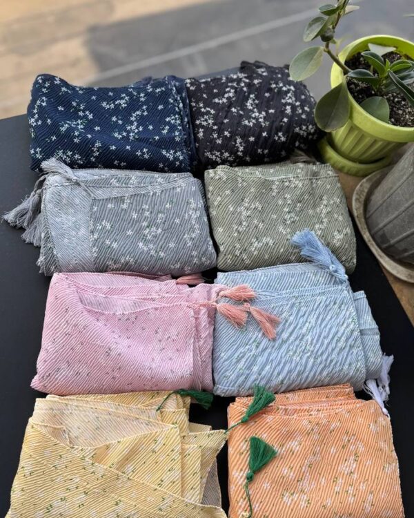شال پلیسه منگوله دار نخی چاپی گلریز عمده (جین 10 تایی کد 951)